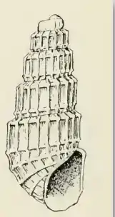 The milk-white shell is elongate, conic and turreted. Its length measures 2 mm. The whorls of the protoconch are deeply obliquely immersed in the first of the succeeding turns, above which only the tilted edge of the last volution projects. The six whorls of the teleoconch are strongly tabulately shouldered at the summit, flat in the middle, sloping suddenly toward the suture. They are ornamented by slender axial ribs, of which 15 occur upon the second and 18 upon the remaining whorls. In addition to the axial ribs, the whorls are marked between the sutures by two strong spiral keels, one of which is situated at the angle of the shoulder, the other at the posterior termination of the anterior third between the sutures. The junctions of the axial ribs and spiral keels are very slightly nodulous. The sutures are deeply channeled. The periphery of the body whorl is well rounded. It is marked by a spiral keel. The base of the shell is well rounded. It is marked by two spiral keels, which divide the space between the peripheral keel and the umbilical area into three equal parts, and the continuation of the axial ribs, which are fainter on the base than on the spire. The aperture is ovate. The posterior angle is obtuse. The outer lip is thin, rendered angular by the keels. The columella is slender, decidedly curved, reinforced by the base. The parietal wall is covered with a thin callus.[4]