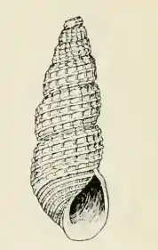 The subdiaphanous to milk-white shell is slender and has an elongate-conic shape. Its length measures 3.3 mm. The whorls of the protoconch are immersed, the last one only being visible. This is somewhat tilted and marked by three strong narrow spiral keels and many slender raised axial threads which cross the grooves between the keels. The six whorls of the teleoconch are well rounded, slopingly shouldered at the summit and separated by constricted sutures. They are ornamented by almost equal and equally spaced spiral keels and axial ribs between the sutures on the spire. There are 4 spiral keels on the first, second, and third whorls, 6 on the fourth, and 7 upon the penultimate whorl. The first of these keels is on the shoulder of the whorl near the summit and is somewhat less developed than the rest. The axial ribs are best developed on the early whorls, where they extend equally strong from the summit to the periphery ; on the antepenultimate and penultimate turns they become somewhat enfeebled from the middle of the whorl between the sutures to the periphery. There are about 16 of these ribs on the first, 18 on the third, 20 upon the fourth, and 22 upon the penultimate turn. The intersections of the ribs and spiral keels form low elongated tubercles, the long axis of which coincides with the spiral sculpture. The meshes enclosed by the keels and ribs are deeply impressed squarish pits. The periphery and the base of the body whorl well rounded, the latter somewhat inflated and marked by six spiral cords, which are successively closer spaced and a little less strongly developed from the periphery to the umbilical area. The channels between the cords are crossed by many very slender raised vertical threads. The aperture is oval, slightly effuse anteriorly. The outer lip is thin. The columella reinforced on its posterior two-thirds by the attenuated base, free and somewhat revolute anteriorly. The parietal wall is glazed by a thin callus.[4]