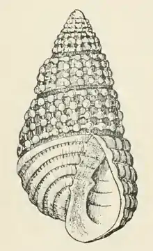 The white shell has an ovate shape. Its length measures 3.9 mm. The whorls of the protoconch are obliquely immersed in the first of the succeeding turns above which only the tilted edge of the last volution projects. The five whorls of the teleoconch are slightly rounded, well contracted at the sutures, and moderately shouldered at the summit. They are marked by nodulose slightly retractive axial ribs of which 20 occur upon the first to second, 18 upon the third, and 22 upon the penultimate turn. In addition to the ribs the whorls are marked between the sutures by four spiral cords considerably less strong than the ribs, which render them nodulous at their junction. The spaces enclosed by the ribs and spiral cords are deep round pits. The sutures are well marked but not channeled. The periphery of the body whorl is marked by a narrow spiral groove. The base of the shell is well rounded. It is marked by six strong broad rounded almost equal and equally spaced spiral cords, the grooved spaces between which are marked by numerous fine axial threads. The aperture is oval, slightly effuse anteriorly. The posterior angle is acute. The outer lip is rendered slightly sinuous by the spiral cords. The columella is slender and curved, provided with a fold, deep within, at its insertion. The parietal wall is covered by a thin callus. [4]