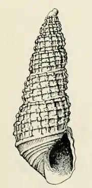 The milk-white shell has an elongate-conic shape. Its length measures 4.5 mm. There are at least two whorls in the protoconch. These are smooth, deeply obliquely immersed in the first of the succeeding turns, above which only a portion of the last two turns project. The seven whorls of the teleoconch are moderately rounded, strongly constricted at the sutures, and slopingly shouldered at the summit. They are ornamented by strong, retractive axial ribs of which 14 occur upon the first, 16 upon the second to fourth, 18 upon the fifth, and 20 upon the penultimate turn. In addition to the axial ribs, the whorls are marked by spiral cords between the sutures, which are a little more than half as strong as the ribs and of which three occur upon the first three whorls and four upon the succeeding turns. The second one below the summit marks the angle of the long sloping shoulder. The junction of the ribs and the cords are strongly nodulous. The spaces inclosed between them are deep squarish pits. The sutures are strongly channeled. The periphery of the body whorl is marked by a broad groove that is crossed by the continuations of the axial ribs which terminate at the posterior margin of the first basal keel. The base of the body whorl is well rounded. It is marked by six spiral cords which are of unequal strength, separated by grooves of different widths, which are crossed by fine axial threads. The aperture is oval, and effuse anteriorly; The posterior angle is obtuse. The thin outer lip is rendered sinuous by the cords. It shows the external sculpture within. The columella is slender, strongly reflected, and provided with a fold at its insertion.[3]