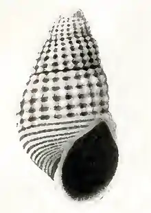 The stout, yellowish white shell has an oval shape. Its length measures 3.5 mm. The whorls of the protoconch are decollated, the pit left in the apex of the type shows that it must have been strongly immersed in the first of the turns of the teleoconch. The 4½ whorls of the teleoconch are strongly rounded, and feebly shouldered at the summit. They are marked by rather slender axial ribs, of which 20 occur upon all the turns. In addition to the axial ribs, the whorls are marked by 5 spiral cords, which are a little stronger than the ribs. The cords are about as wide as the spaces that separate them. Their junctions with the ribs form rounded tubercles, while the spaces enclosed between them are strongly impressed concaved pits. The suture is not channeled. The base of the shell is rather long, somewhat inflated, and well rounded. It is marked by 10 strong spiral cords, which decrease in size gradually and regularly from the periphery to the umbilical chink. The grooves between these spiral cords, which are about equal to the cords in width, are armed by numerous slender axial riblets. The oval aperture is decidedly effuse anteriorly. The posterior angle is acute. The thin outer lip is rendered wavy at the edge by the external sculpture. The inner lip is long, oblique, curved, and somewhat revolute. It is provided with a strong oblique fold at its insertion. The parietal wall is covered by a moderately thick callus.[1]