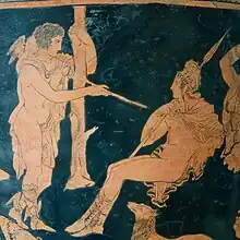 The A-side scene on the belly of the kalyx-krater depicts Homer's story of Odysseus's visit to the Underworld to consult the dead seer Teiresias. This meeting is known as a nekuomanteion or "consultation with the dead".[4]