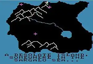 The map of islands in the Sargalo Sea in which you navigate your ship consists of a ring of islands around the perimeter of the screen. Your ship starts out next to the island you just left (in the lower right of the screen) while the island of the evil wizard (your goal) is in the upper left. You may land on other islands to stock up on food and resources but for the most part these islands are not fully explorable as the first one was, and serve only as places to stock up on supplies by displaying a few lines of text after you land (with one exception—see below). Navigation is a complex scheme, as you are at the mercy of wind and currents (and whether the vessel has any intact sails left) and you cannot navigate directly as you can in early Ultima titles. You must set the sails in different directions in order to catch the wind, and raise and lower anchor to start and stop your ship. Hazards include running aground if the player weighs anchor too close to shore, being caught in a whirlpool which may destroy the ship or destroy its sails, scurvy among the crew, calm winds (which is harmless to the ship but prevents any progress until the winds start up again) and falling off the edge of the world if the ship gets too close to the edge of the map.