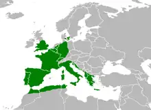Western and southern Europe, from the Iberian Peninsula to Greece; it is absolutely common in Mediterranean countries and penetrates in Central Europe to middle of Germany and British Isles; it has reached Denmark, where it is rare and sporadic. It is also recorded from the Maghreb. It is absent from alpine countries and Eastern Europe.