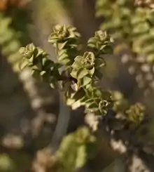Oedera squarrosa is a small, erect shrublet (60cm high). The leaves are small (15mm x 7mm), ovate, glandular and down-curved, with thickened margins, and grow densely packed along the stems. On the younger stems, the leaves are usually in four ranks. Older stems often have a more imbricate arrangement.