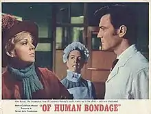Of Human Bondage is a 1964 British drama film directed by Ken Hughes and starring Kim Novak and Laurence Harvey in the roles played by Bette Davis and Leslie Howard three decades earlier in the original film version. This MGM release, the third screen adaptation of W. Somerset Maugham's 1915 novel, was written by Bryan Forbes from the novel by Somerset Maugham.