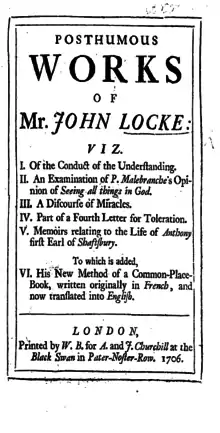 Of the Conduct of the Understanding is a text on clear and rational thought by John Locke,[1] published in 1706, two years after the author's death, as part of Peter King's Posthumous Works of John Locke. It complements Locke's Some Thoughts Concerning Education, which explains how to educate children.[2]