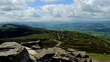 - Moel Famau, 555 m (1,820 ft) and Jubilee Tower at summit