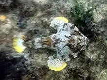 The polka-dot batfish preys on juvenile fish, crabs, shrimps, molluscs, and worms. It hunts by clinging to the bottom with its pectoral fins and wiggling the moveable, modified dorsal fin beneath its rostrum to attract prey.[2] The rostrum also contains a chemical that helps attract the prey.[3] When the prey is sufficiently close, it snatches the victim with its circular mouth. They sit and wait for their prey to come to them instead of chasing after their prey. They are very stealthy and stalk their prey before attacking. If approached by predators, the batfish bury themselves in the sand with their pectoral fins or scurry across the ocean bottom like a crab.[4]