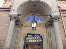 This original depot location proved not to be very well-suited for a passenger rail hub. Local newspapers complained about, among other things, the need to walk a quarter-mile of wood boardwalk over swampy ground to reach the station. So the Union Pacific and Central Pacific launched a jointly-owned terminal railroad company, the Ogden Union Railway & Depot Co. (OUR&D), to oversee the construction and operation of a new Union Station.[4] Completed in 1889, this new structure was designed in the Romanesque Revival style, with a large clock tower in the center. Considerably larger than the original station and constructed of brick, it held 33 hotel rooms, a restaurant, barbershop, and other conveniences for travelers. In 1923, a fire that began in a hotel room destroyed the station's interior and left the walls and clock tower in a fragile state. No deaths or injuries were reported, and work continued inside the first floor to some extent, but construction on a new building did not start until a stone from the clock tower fell and struck a railroad clerk, killing him instantly. Originally, the OUR&D planned to rebuild the station to its original design, but the accident reversed this decision and a new design was proposed by John and Donald Parkinson, architects of the Caliente Depot in Nevada and the Kelso Depot in California.[6] The construction of the current building was completed in 1924 in the Spanish Colonial Revival (also known as Early Christian/Byzantine) style and is built on the foundation of the earlier building.[7] It was dedicated on November 22 of that year, with a series of publicity shots being taken. One of these shots, showing 13 young women pulling the first train to arrive at the station by ribbons, made its way into the La Domenica del Corriere, an Italian newspaper, with the headline "Curious American Custom".[8] The ceiling of the Grand Lobby, taking up the center portion of the building, has a height of 56 feet and extends to the roof. The trusses were originally painted in bright colors with geometric designs, but have since been painted over with a faux wood grain. Murals of the construction of the Transcontinental Railroad were painted on the north and south end of the lobby. The second floors of the north and south wing were occupied by Southern Pacific (which had purchased the Central Pacific in 1885), Ogden Union Railway & Depot Co., and Union Pacific Telegraph Department offices.[6]