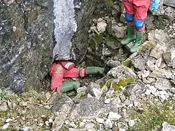 The entrance to the cave was discovered in 1957 by Vic Howells. Further investigation and the removal of debris showed an entrance in which a pool of water accumulated. In the ensuing period, the water was drained away and a 400-foot (120 m) passage was revealed ending in a boulder choke.[1] The major breakthrough into the system beyond the entrance series occurred in 1984, before which the cave consisted of little more than the entrance series and several uninspiring passages.[2] In 1986 Martyn Farr connected the Terminal Sump to Elm Hole in the next valley by cave diving.[3]