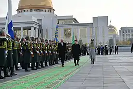 ![]() Azerbaijani president, Ilham Aliyev, with the president, Gurbanguly Berdimuhamedow, at the Palace in 2018. | |