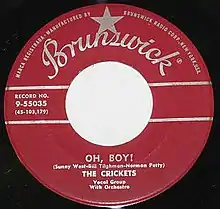 "Oh, Boy!" is a song written by Sonny West, Bill Tilghman and Norman Petty. The song was included on the album The "Chirping" Crickets and was also released as the A-side of a single, with "Not Fade Away" as the B-side. The song peaked at number 10 on the US charts,[1] number 3 on the UK charts in early 1958,[2] and number 26 in Canada.[3] (See 1958 in music for more context.)