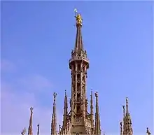 "Oh mia bèla Madunina" (Classical Milanese orthography: Oh mia bella Madonnina [o ˌmi.a ˈbɛla maduˈniːna]; "Oh my beautiful little Madonna" in Milanese) is a song by Giovanni D'Anzi which is an unofficial city anthem of Milan.[1] The title refers to the golden statue of the Virgin Mary on the spire of Milan Cathedral visible all over the city, namely the Madonnina (Madunina in the Milanese dialect).