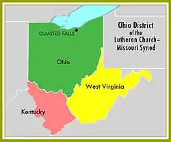 The Ohio District is one of the 35 districts of the Lutheran Church–Missouri Synod (LCMS), and covers the states of Ohio and West Virginia, as well as north eastern Kentucky[1] (the remainder of Kentucky is divided between the Indiana District and the Mid-South District). In addition, sixteen Ohio congregations are in the non-geographic English District,[2] and eleven are in the SELC District.[3] The Ohio District comprises 167 congregations and missions, subdivided into 16 circuits, as well as 39 preschools, 19 elementary schools, and 2 high schools. Baptized membership in Ohio District congregations is approximately 54,576.[4]
