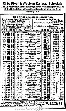 The Ohio River & Western Railroad was a 112-mile long (180 km) narrow gauge railway that was incorporated in 1875 and operated from 1877 or 1878 till 1931. The railroad was located in southeastern Ohio. The line ran from Bellaire (east point) to Zanesville (west end).