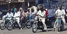 The use of motorcycle taxis in Nigeria predates the Babangida administration: they were known in the Cross River State in the 1970s while Achaba or motorcycle taxis were also present in parts of Yola and Gongola State (now Adamawa State) in the late 1970s and spread to Lagos through a group of individuals in the Agege Local Government Area.[7][3] Okadas began to spread in the 1980s and became more popular in the late 1980s following an economic downturn in Nigeria, which was partly a consequence of the adoption of a liberal economic policy in the form of a structural adjustment program combined with rapid urbanization, unemployment, and inadequate intra-city public transportation.[3] Some of the advantages of the use of motorcycle taxis for intra-city commercial transport are that they are readily available.[3] They can also easily navigate through narrow roads, rough terrain, and remote areas and meander through the hectic urban traffic, thereby meeting the unmet transport needs of some urban residents. Unemployed youths began to use motorcycles to earn money by transporting passengers swiftly to their doorsteps and sometimes on narrow or poorly maintained roads.[3] This type of transportation quickly became popular, and acceptance of it increased steadily. Okadas are now one of the primary modes of transportation in Nigeria, and constitute a cheap and adaptable transportation system, the most popular informal one in the country. Even in remote villages, they arrive at regular intervals. It has become a means of transportation regularly used by people of all ages, men and women alike. Unfortunately, the rise in okada usage has been accompanied by increased occurrences of risky driving and accidents on Nigerian roads. As a result, okadas have come under heavy criticism, resulting in legislation intended to restrict or prohibit their operation in some Nigerian cities, notably Lagos in 2012.[8]