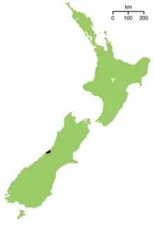 The Okarito brown kiwi lives in the Okarito forest on the West Coast of New Zealand's South Island.[4][9] On 29 June 2010, three breeding pairs were released onto Blumine Island as part of a breeding programme.[10] A new population was established in the Omoeroa Ranges near Fox Glacier in late 2018.[11] In 2021 signs of Rowi were detected in Ballyhooly Bush, remnant mataī forest on the Lower Whataroa River flats, 24 km from Ōkārito forest.[12]