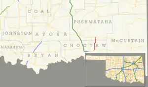 State Highway 147 (abbreviated SH-147) is a state highway in Oklahoma. It runs 13.58 miles (21.85 km)[1][2] in Choctaw and Pushmataha counties. Highway 147 begins at US-70, just east of Sawyer. From there it runs north, up the east side of Hugo Lake. There is a one-mile (1.6 km) dogleg to the east just south of the community of Spencerville, and another short dogleg east at the Choctaw–Pushmataha county line. SH-147 terminates at SH-3 in Oleta.