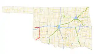 State Highway 6, abbreviated SH-6 or OK-6, is a state highway in Oklahoma. It runs in a 121.8 miles (196.0 km) crescent through the southwestern part of the state, running from the Texas state line north of Quanah, Texas, to SH-152 in the unincorporated town of Sweetwater. There are no letter-suffixed spur branching from SH-6.