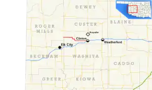 SH-73 turns south along SH-44, forming a concurrency. The two routes curve southwest to cross Oak Creek. SH-44/73 travel together for 2 miles (3.2 km)[3] before SH-73 splits off, returning to a due east course. The highway parallels I-40, which runs to the south of SH-73. SH-73 then bridges the Washita River. West of Clinton, the highway crosses a set of railroad tracks at the unincorporated locale of Ralph.[2] State Highway 73 then enters Clinton, where it comes to an end at an intersection with I-40's Clinton business loop.