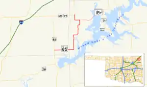 State Highway 85 (abbreviated SH-85 or OK-85) is a state highway in the northeastern part of the U.S. state of Oklahoma. The highway is 13.3 miles (21.4 km) long. SH-85 provides access to the northwest shore of Grand Lake, a major recreation center for northwest Oklahoma. SH-85 has one lettered spur highway, SH-85A.