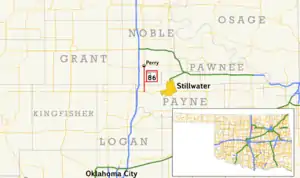 State Highway 86 (abbreviated SH-86) is a state highway in the U.S. state of Oklahoma that connects SH-51 with Perry and is 12.06 miles (19.41 km) long. The highway is contained wholly in Payne and Noble Counties. SH-86 has no lettered spurs or loops.
