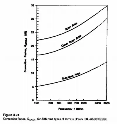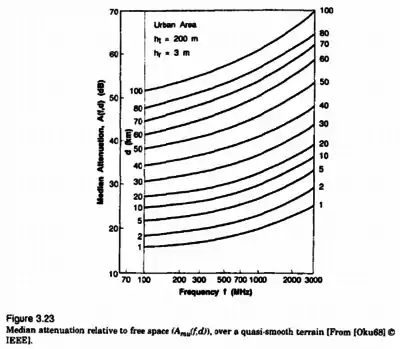 Plots of Amu(f, d) and GAREA for a wide range of frequencies are shown in Figure 3,23 and Figure 3.24. Furthermore, Okumura found that G(hte) varies at a rate of 20 dB/decade and G(hre) varies at a rate of 10 dB/decade for heights less than 3 m. G(hte) = 20 log(hte/200) 1000 m > hte > 30 m