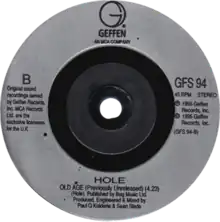 The first official release of "Old Age" was in April 1993, when an acoustic version appeared as a B-side on the Hole single, "Beautiful Son." A second, more polished studio version, featuring different lyrics and a different ending, was recorded by Paul Q. Kolderie and Sean Slade at Triclops Sound Studios in Marietta, Georgia in October 1993, during the sessions for what became Hole's second album, Live Through This. The song features pump organ by Slade. The full recording was omitted from the album, released in April 1994, but part of it was attached to the beginning of the song "Credit in the Straight World," which appears on the album. The full song was released as a b-side to the "Violet" single in March 1995, and re-released on the rarities compilation, My Body, the Hand Grenade, in October 1997. On February 14, 1995, Hole played the song as a part of their MTV Unplugged set in New York City.[7]