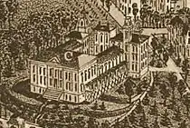 The main building consists of a three-story front section measuring 100 feet (30 m) by 50 feet (15 m), and two rear wings, each measuring 25 feet (7.6 m) by 79 feet (24 m), giving the building a U-shape.[1] The facade of the central section contains a portico with four Ionic columns supporting a large pediment, and accessed by a marble staircase.[1] One of the rear additions was designed in the Italian Renaissance style, and another contains Neoclassical elements.[1] The buildings' interiors have been modified extensively over the years as the role of the complex changed.[1]