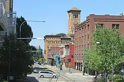 All blocks are laid out so that major building entrances face the streets, which run north and south, and the buildings are constructed with common walls, which cover the entire depth of the block, deleting any need for alleys. Thus, with the exception of Pacific Avenue, where business fronts face each other, business fronts tend to be located on the east. The western exposures represent the back of the structures. From the bluff to Pacific Avenue the land is level, but Commerce and Broadway form terraces on the steep hillside. As a result, a facade which appears as a single story on the west side of the street is scaled a full three stories on the east.[2] The pivotal structures dominate the District skyline. As a result, there are a number of vistas that rise and conclude within the boundaries. Views north along Broadway, Commerce and Pacific conclude with the Elks Temple, Old City Hall and Northern Pacific Office Building. Similarly, sight lines from the eastern portion of the district terminate with the last two buildings mentioned. Views to the south along Broadway are distinctly terminated by the Winthrop and Bostwick Hotels as they are on Commerce by virtue of the dominance of the Winthrop Hotel and the Motoramp Garage.[2]