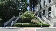 Of even greater significance at this time, when the proximity of a residential neighborhood to the north of the Elks Temple is understood, is the Spanish Steps to the south of this edifice. Were these not to exist, pedestrian access to the City Hall from Broadway would have constituted a lengthy detour around business blocks. These stairs were built to satisfy city fire code requirements for a second story exit from the Elks Temple, and it is unknown if pedestrian access was noted as a determining factor of their design. However, in 1936, when the Elks Club attempted to close the stairs to the public, city officials intervened as legal owners of the dedicated street, thus emphasizing the importance of the steps to foot traffic.[2]