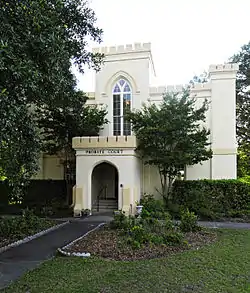 Old Colleton County Jail is a historic library building located at Walterboro, Colleton County, South Carolina. It was built in 1856, and is a stuccoed brick building in the Gothic Revival style. The building was designed by noted Charleston architects, Edward C. Jones and Francis D. Lee. The jail in part resembles a miniature, fortified castle. The front façade has crenellated parapets, turret-like structures at either corner, and a massive central tower with a large lancet window above the main entrance.[2][3]