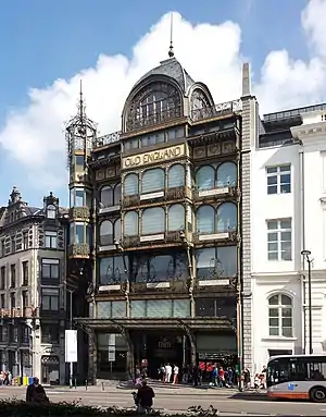 None of these architectural strategies were new for the department store or retail shop as a building type, but Saintenoy's Old England store is one of the earliest examples of the bare iron/steel-and-glass curtain-wall facade being employed on such a large scale (most earlier department stores had clad their metal frame in some kind of masonry, at least on the facade). Horta would employ the same strategy on his famous À L'Innovation store in Brussels, completed in 1901, as would Henry Gutton on his Grand Bazar de la rue de Rennes in Paris, a branch of the Magasins Réunis department store chain, finished in 1907.[2]