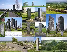 Little now remains visible of the original town site beyond the low-walled churchyard, which contains the damaged round tower, the remnants of a church, two Irish High Crosses, the base of another large cross, and many graves. However, further traces of structures can be seen in aerial photography.