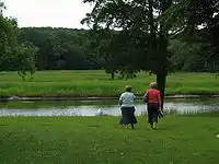 The town of Lyme was set off from Saybrook (now known as Deep River), which is on the west bank of the Connecticut River mouth, on February 13, 1665. South Lyme was later incorporated from Lyme in 1855, then renamed Old Lyme in 1857, because it contains the oldest-settled portion of the "Lymes".[2] Old Lyme occupies about 27 square miles (70 km2) of shoreline, tidal marsh, inland wetlands, and forested hills. Its neighbor to the north is the town of Lyme, and to the east is East Lyme. Other place names from the same root are Hadlyme, a neighborhood (partly in the town of Lyme and partly in the town of East Haddam), and South Lyme (a beach resort area of Old Lyme). The place name "Lyme" derives from Lyme Regis, a small port on the coast of Dorset, England, from which it is believed the early settlers migrated in the 17th century.[3] The picturesque Old Lyme Cemetery contains the graves of the original settlers. The Duck River flows through the cemetery and into the Connecticut River at Watch Rock Park.