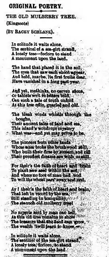The descendants of Friedrich Kleeman lay claim to the first planting. Friedrich's wife, Maria née Helm died the day before the arrival of the Solway on 16 October 1837 and her remains were brought ashore and buried. An obituary notice of Friedericke Wilhelmine Till (Friedrich's daughter) who died in 1928 stated that her mother was buried in the Old Cemetey at Kingscote, near the Mulberry Tree, which was brought out by the Kleeman family from Germany.[6] Other newspaper reports in 1936 state that Mrs Kleeman was buried where the Mulberry Tree stands, the tree being planted on her grave.[7][8]