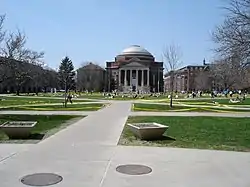 In 1906, architecture professors Frederick William Revels and Earl Hallenbeck, created a plan to convert the Old Oval into a Great Quadrangle. Their work resulted in the construction of Bowne, Carnegie library, Sims, and Machinery halls and Archbold Gymnasium, which were all completed by 1909.[4] It has served as a 200 ft. by 150 ft. rose garden, a skating rink, and was even used for military drills during World War I. It was also the terminus of a toboggan slide from Mount Olympus. By 1914, the Oval had come to be known as the "Old Oval", and in 1929 it was filled in with earth from various excavations to create the central lawn area known simply as the quad.[1][2]