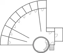 Built to a design adapted from Jeremy Bentham's Panopticon prison. This design is unique in the British Cape Colony. Designed to allow for constant surveillance of the prisoners. The prison is shaped as a quarter circle with eight cells, roughly 2m by 3m each, running along the curved arc of wall with the exercise area's for each cell radiating out from the double story watch tower, which has portals looking into each exercise area.[1]