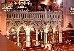 Centered above the Sanctuary on the east side of the church is a copper clad cupola surrounded by twelve ornate gothic arched windows. This feature is reminiscent of the cupolas of the Basilica of St. Mark in Venice. While the lantern provides a striking visual presence, it was also built with function in mind. In the days before mechanical fans and air conditioning, a series of mechanically operated louvers allowed for window panels to be opened to help cool the sanctuary inside.