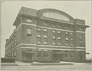 The five-story building, approximately 101 by 235 feet, was designed by J. E. Sirrine and Company in Renaissance Revival style and was built by Fiske-Carter Construction Company on West Washington Street, near its intersection with Academy Street, in the western part of Greenville's central business district. The building had load bearing brick perimeter walls that incorporated "horizontal reinforced concrete and granolithic bond beams." Its auditorium, on the second level, included a stage and a balcony; and the tongue-and-groove maple floors were designed to accommodate operating textile machinery.[4]