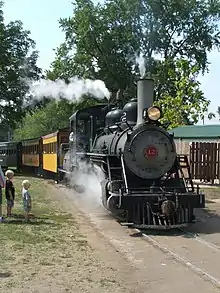 The Midwest Central Railroad operates a 3 ft (914 mm) narrow gauge railway around the reunion exhibit area. This railroad features a 3-truck Shay locomotive from the West Side Lumber Company railway. Other engines include two 2-6-0 Baldwin engines (one having a recently updated boiler and the other undergoing extensive rework) that formerly served logging railroads in the eastern United States and a German 0-4-0 built by Henschel & Son. For routine operations, there are two Plymouth Locomotive Works diesel switch engines, one of them run if there's something wrong with one of the two trains that run each day, and a Vulcan Iron Works gasoline switch engine.[6] [7] In addition to operating during the reunion, the Midwest Central Railroad has public events connected to Independence Day, Halloween and Christmas.[8]