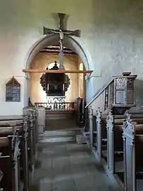 Although the church contains a few other original, medieval features such as a wooden crucifix and a stone altar, it is best known for its intact interior from the 16th and 17th centuries. The pulpit is from 1579 and is one of Norway's oldest. An altar frontal from 1699 can also be found in the church. A unique mural from 1632 depicting the Dano-Norwegian coat of arms, has been partially revealed on the interior north wall. [6]