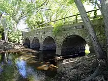 The Old Town Bridge is a historic stone arch bridge in Wayland, Massachusetts. It is located just north of Old Sudbury Road, and is sited across what was formerly a channel of the Sudbury River, which now flows just west and north of the bridge. The four-arch bridge was built in 1848 by Josiah Russell on a site where it is supposed that the first bridge in Middlesex County was built in the 1640s. It was for many years on the major east–west route connecting Boston to points west and south. Originally built of dry-laid stone, the bridge was rebuilt with mortar after being damaged by flooding in 1900. It is 60 feet (18 m) long and has a roadbed 20 feet (6.1 m) wide, with each arch spanning about 10 feet (3.0 m). The bridge was open to vehicular traffic until 1955.[2]