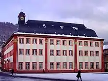 The Old University was built over a period of 23 years between 1712 and 1735, based on plans by the baroque architect Johann Adam Breunig. The structure replaced a four-story college building belonging to the university called the "Casimirianum," which had been erected in 1591 by the Count John Casimir.[1] The construction work was part of the rebuilding effort following the destruction of the city of Heidelberg in the War of the Palatine Succession (1688-1697). The building was at first named Domus Whilhelmiana, after the donor, Elector Johann Wilhelm. In 1886, on the occasion of the 500 year anniversary of the founding of the University of Heidelberg, the Alte Aula ("Old assembly hall") in the west wing was remodelled in the Renaissance Revival style. The current name, "Old University" came into use in the early 1930s following the erection of the lecture hall building known as New University on the opposite side of Universitätsplatz.