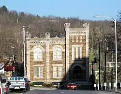 The Washington County Jail is a historic former civic building at 90 South College Avenue in Fayetteville, Arkansas. Built in 1896, this building was the fourth to serve as county jail, and was in use until 1973, making it the longest tenured in county history.[2] The Romanesque Revival building was designed by W. B. Reese, and is locally unusual and distinctive for its medieval appearance. It is built out of load-bearing stone, square cut and laid in irregular courses, with a rough quarry-cut finish. Most of the building is of darker shades with trim in lighter shades. Nominally two stories in height, the rightmost bay has a square tower with crenellated parapet.[3]