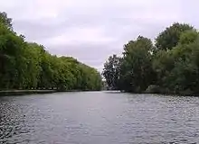 In 1822 the lock cut and lock were built by the Thames Navigation Commissioners, considerably shortening the navigation and towpath. Instead of a weir, a less formal obstruction, eel bucks, "Newman's Bucks", retained water around two islets above the cut. The islets measured in the 1890s 0.59 acres (0.24 ha) and 1.4 1.4 acres (0.57 ha).[2] The smaller, downstream one, is Lion Island. The first lock keeper was dismissed after demeanors which included digging through the bank of the lock cut and thereby causing the collapse of the new lock cut bridge. The weir was constructed in 1836. In 1868 there was discussion of removing the lock, but instead it was extended with a tumbling bay added. In 1871 the lock cut bridge was rebuilt with the right reserved to lay sewage pipes across it.[3] The island has the sanitation works for Windsor.[4] The lock was rebuilt in 1957.