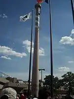 Outside the stadium's main entrance gate stands a 138-foot (42 m) tall exhaust pipe in the shape of a baseball bat, complete with tape at the handle that frays off at the end. It is sponsored by Hillerich & Bradsby, makers of the famous Louisville Slugger line of baseball bats, which is specifically designed to look like a Babe Ruth model. As the most prominent feature on the stadium's exterior, recognizable even to first-time visitors, the bat was often used as a designated meeting spot for fans to meet their ticket holding friends before entering the stadium.