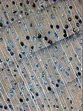 Magnified cross-section of black walnut, showing the vessels, rays (white lines) and annual rings: this is intermediate between diffuse-porous and ring-porous, with vessel size declining gradually