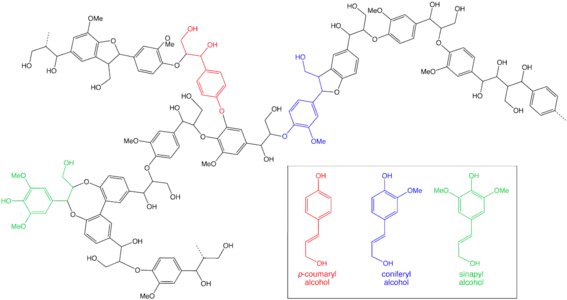 In chemical terms, the difference between hardwood and softwood is reflected in the composition of the constituent lignin. Hardwood lignin is primarily derived from sinapyl alcohol and coniferyl alcohol. Softwood lignin is mainly derived from coniferyl alcohol.[30]